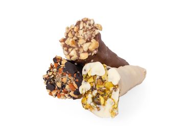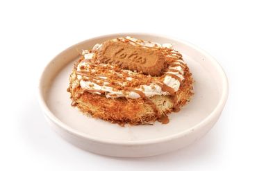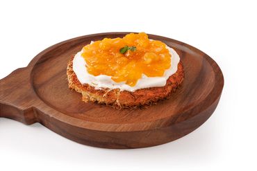 Ripe mango purée whipped with cream inside a fresh crunchy kunafa frame.